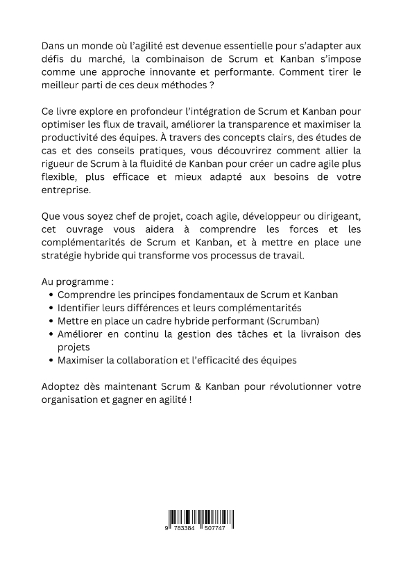 Dans un monde où l'agilité est devenue essentielle pour s'adapter aux défis du marché, la combinaison de Scrum et Kanban s'impose comme une approche innovante et performante. Comment tirer le meilleur parti de ces deux méthodes ?Ce livre explore en profondeur l'intégration de Scrum et Kanban pour optimiser les flux de travail, améliorer la transparence et maximiser la productivité des équipes. À travers des concepts clairs, des études de cas et des conseils pratiques, vous découvrirez comment allier la rigueur de Scrum à la fluidité de Kanban pour créer un cadre agile plus flexible, plus efficace et mieux adapté aux besoins de votre entreprise.Que vous soyez chef de projet, coach agile, développeur ou dirigeant, cet ouvrage vous aidera à comprendre les forces et les complémentarités de Scrum et Kanban, et à mettre en place une stratégie hybride qui transforme vos processus de travail. Au programme : Comprendre les principes fondamentaux de Scrum et Kanban Identifier leurs différences et leurs complémentarités Mettre en place un cadre hybride performant (Scrumban) Améliorer en continu la gestion des tâches et la livraison des projets Maximiser la collaboration et l'efficacité des équipesAdoptez dès maintenant Scrum & Kanban pour révolutionner votre organisation et ga-gner en agilité !