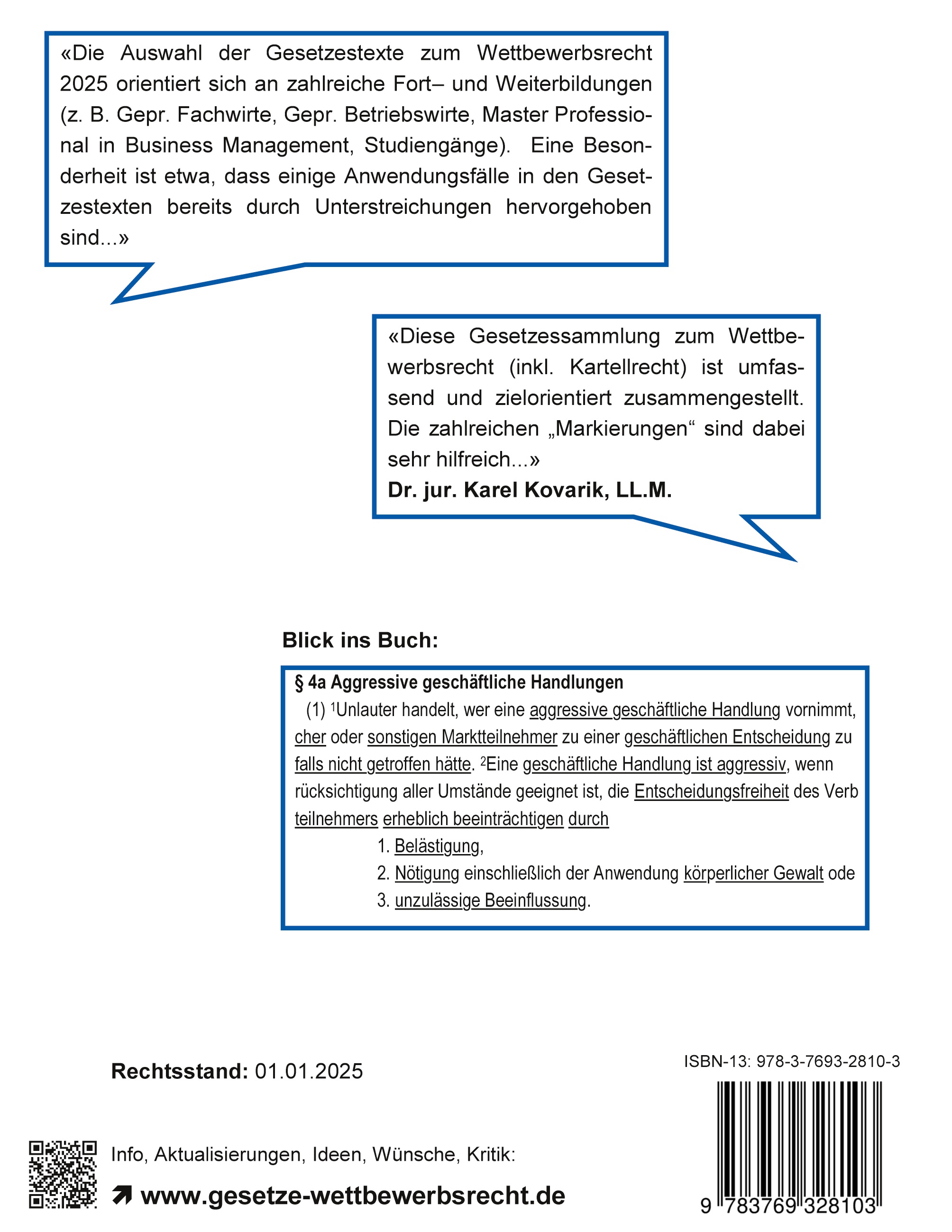 Die unkommentierten Gesetzestexte "Wettbewerbsrecht 2025" enthält zahlreiche relevante Gesetzestexte aus dem Wettbewerbsrecht (Rechtsstand: 01.01.2025), die auch optimal auf die Anforderungen im Rahmen einer Fort- bzw. Weiterbildung (z. B. Gepr. Fachwirte wie etwa Gepr. Wirtschaftsfachwirte, Gepr. Fachwirte für Marketing, Gepr. Technische Betriebswirte, Gepr. Industriefachwirte, Master Professional in Business Management sowie betriebswirtschaftliche Studiengänge oder Seminare) abgestimmt sind.