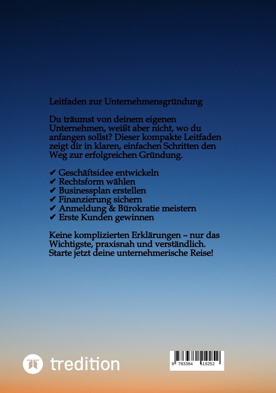 Dein Weg zum eigenen Unternehmen - einfach und klar!Dieses Buch ist dein praktischer Begleiter zur Unternehmensgründung. In einfachen und klaren Schritten zeigt es dir, wie du deine Geschäftsidee in die Realität umsetzt. Von der Planung über die Anmeldung bis hin zu den ersten Kunden - verständlich, kompakt und praxisnah. Perfekt für alle, die ohne Umwege starten möchten!