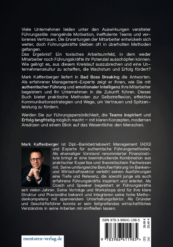 Mark Kaffenberger liefert in »Bad Boss Breaking« die Antworten. Als erfahrener Management-Experte zeigt er Ihnen, wie Sie mit authentischer Führung und emotionaler Intelligenz Ihre Mitarbeiter begeisternund Ihr Unternehmen in die Zukunft führen. Dieses Buch bietet praktische Methoden zur Selbstreflexion,effektive Kommunikationsstrategien und Wege, um Vertrauen und Spitzenleistungzu fördern.