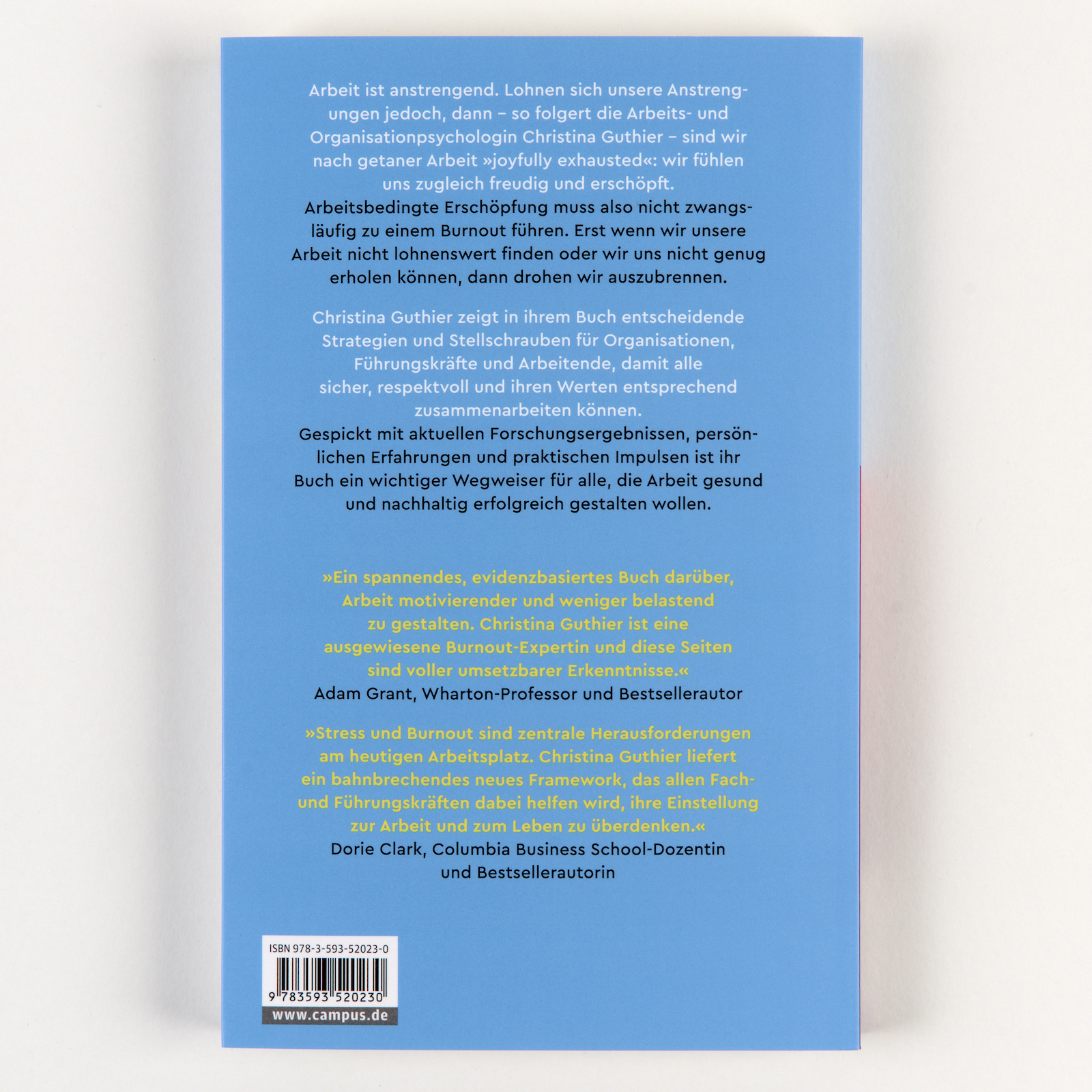 »Ein einsichtsreiches Buch zur richtigen Zeit. Christina Guthier verknüpft persönliche Geschichten mit aktueller Forschung und macht das Thema Erschöpfung nicht nur greifbar, sondern auch gestaltbar. Wer nicht ausbrennen, sondern joyfully exhausted sein möchte, findet hier Inspiration und konkrete Impulse – für sich selbst, für Teams und für Organisationen.« Christian Busch, USC Marshall-Professor und Bestsellerautor