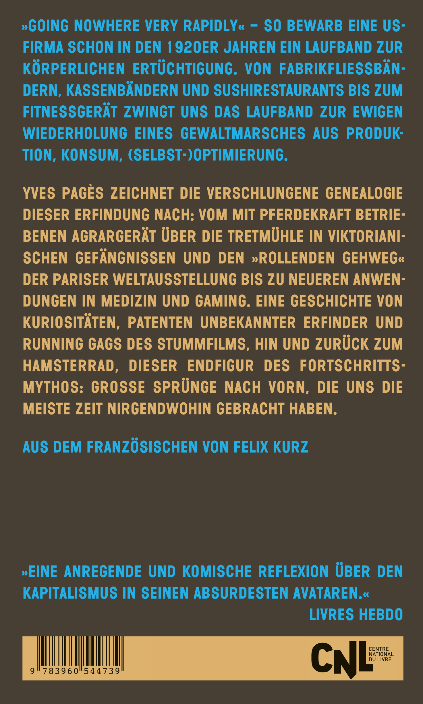 »Indem er die Geschichte des Laufbands nachzeichnet, liefert Yves Pagès eine anregende und komische Reflexion über den Kapitalismus in seinen absurdesten Avataren.« Livres Hebdo