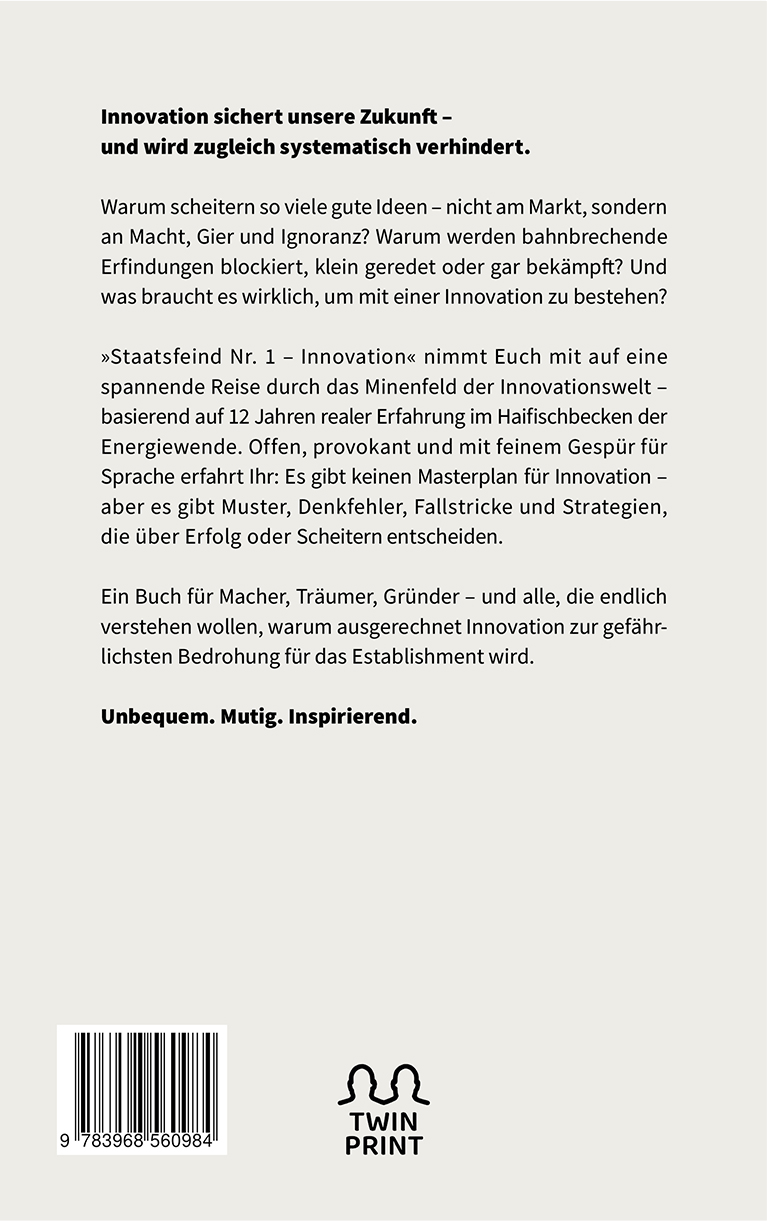 Staatsfeind Nr. 1 – Innovation nimmt Euch mit auf eine spannende Reise durch das Minenfeld der Innovationswelt – basierend auf 12 Jahren realer Erfahrung im Haifischbecken der Energiewende. Offen, provokant und mit feinem Gespür für Sprache erfahrt Ihr: Es gibt keinen Masterplan für Innovation – aber es gibt Muster, Denkfehler, Fallstricke und Strategien, die über Erfolg oder Scheitern entscheiden.