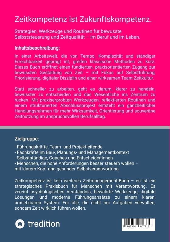 | Schlagworte | Digitale Disziplin • Fokus und konzentration • Kalender- und Wochenarchitektur • Priorisierung und Planung • Reflexion und Routinen • Selbstführung • Systemische Zeitstrukturen • Team-Zeitkultur und Führung • Zeitkompetenz • zeitmanagement methoden • Zeitmanagement Modelle • Zeit, Psychologie und Denkfehler |