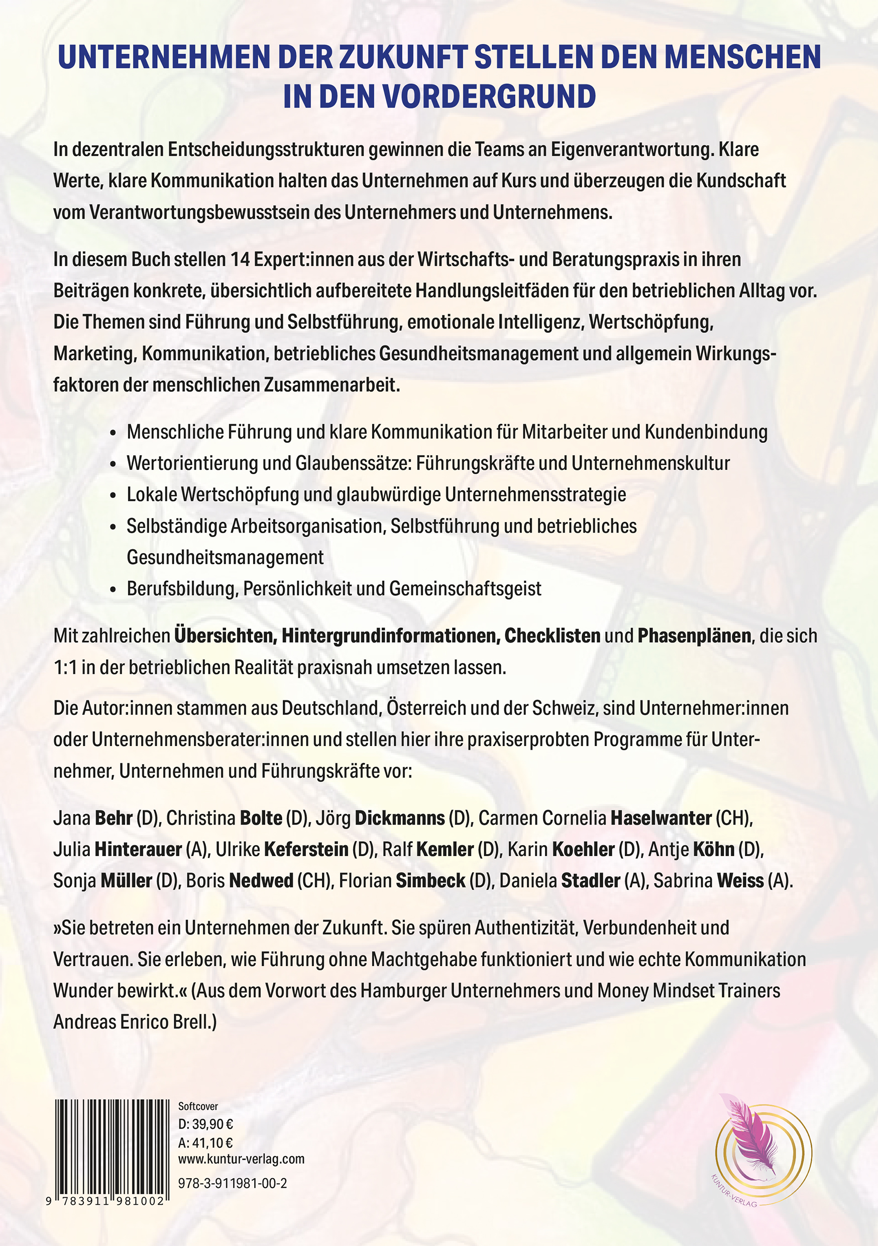 | Schlagworte | Andreas Enrico Brell • Europa • Frauengesundheit • Frauen in Unternehmen • Führung • Führungskraft • Führungsorganisation • Gesundheitsmanagement • Gründung • Hermann Scherer • Hochschule • Kommunikation • Marketing • Mindset • MoneyMindset • new work • Personalführung • Ratgeber • Sachbuch • Sammelband • Scherer • Teamwork • Unternehmen • Unternehmensführung • Unternehmensvision • Unternehmer • Wechsel • Wechseljahre • Werteorientierung |
