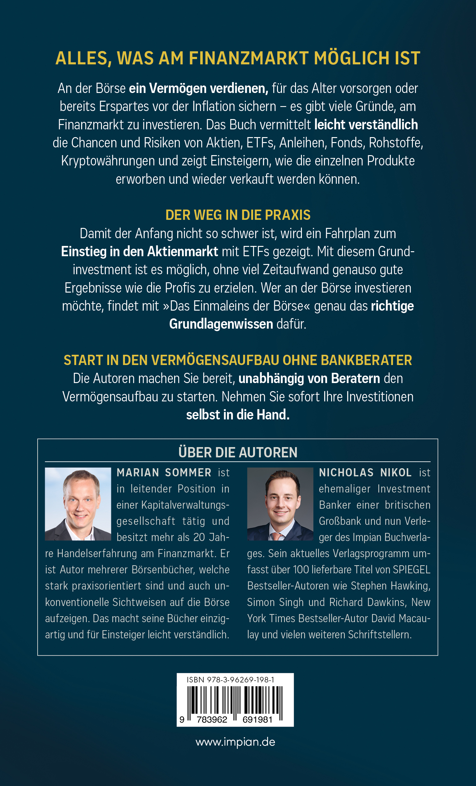 | Schlagworte | Aktien • Altersvorsorge • Anlagestrategien • Anleihen • Bitcoin • Börse • ETF • Finanzbuch • Finanzen • Investieren • kryptowährungen • Privatanleger • Rohstoffe • Vermögensaufbau • Wertpapiere • Zertifikate |