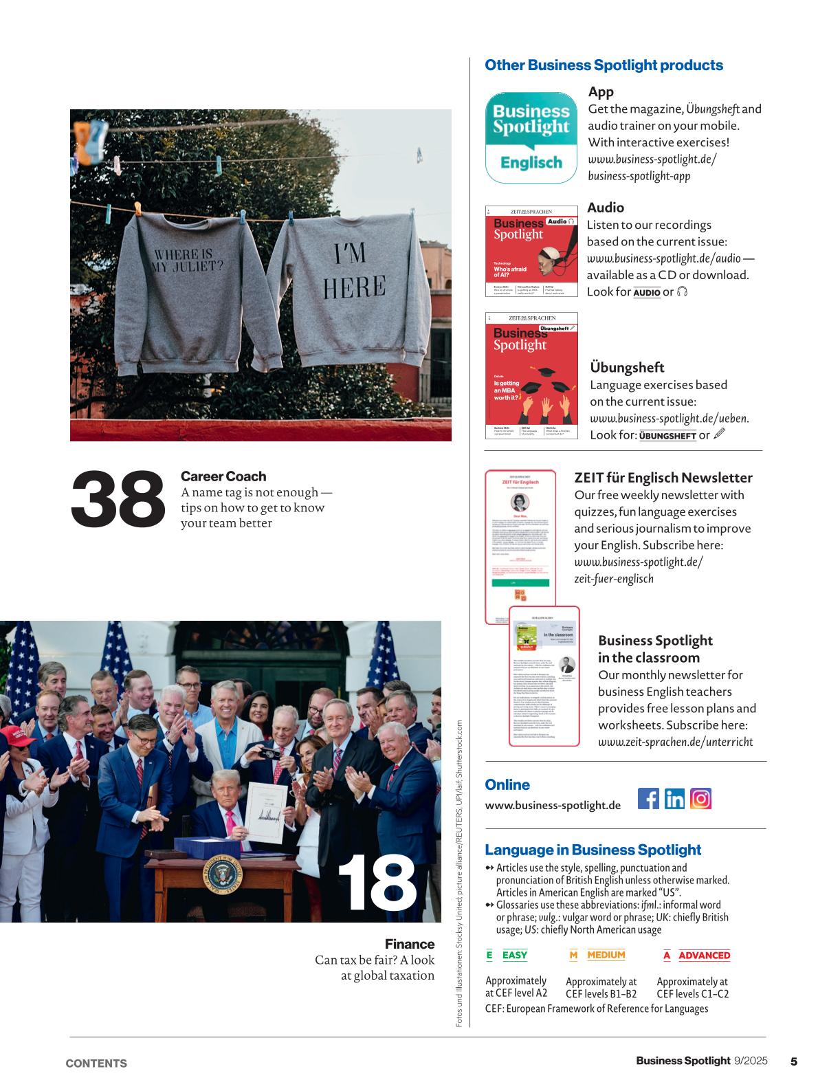 Business Spotlight verbessert nicht nur Ihr sprachliches Niveau in der internationalen Geschäftswelt, sondern gibt Ihnen darüber hinaus auch Tipps und Tricks für interkulturelles Arbeiten sowie aktuelle Berichte zu interessanten Ereignissen der Business-Welt.