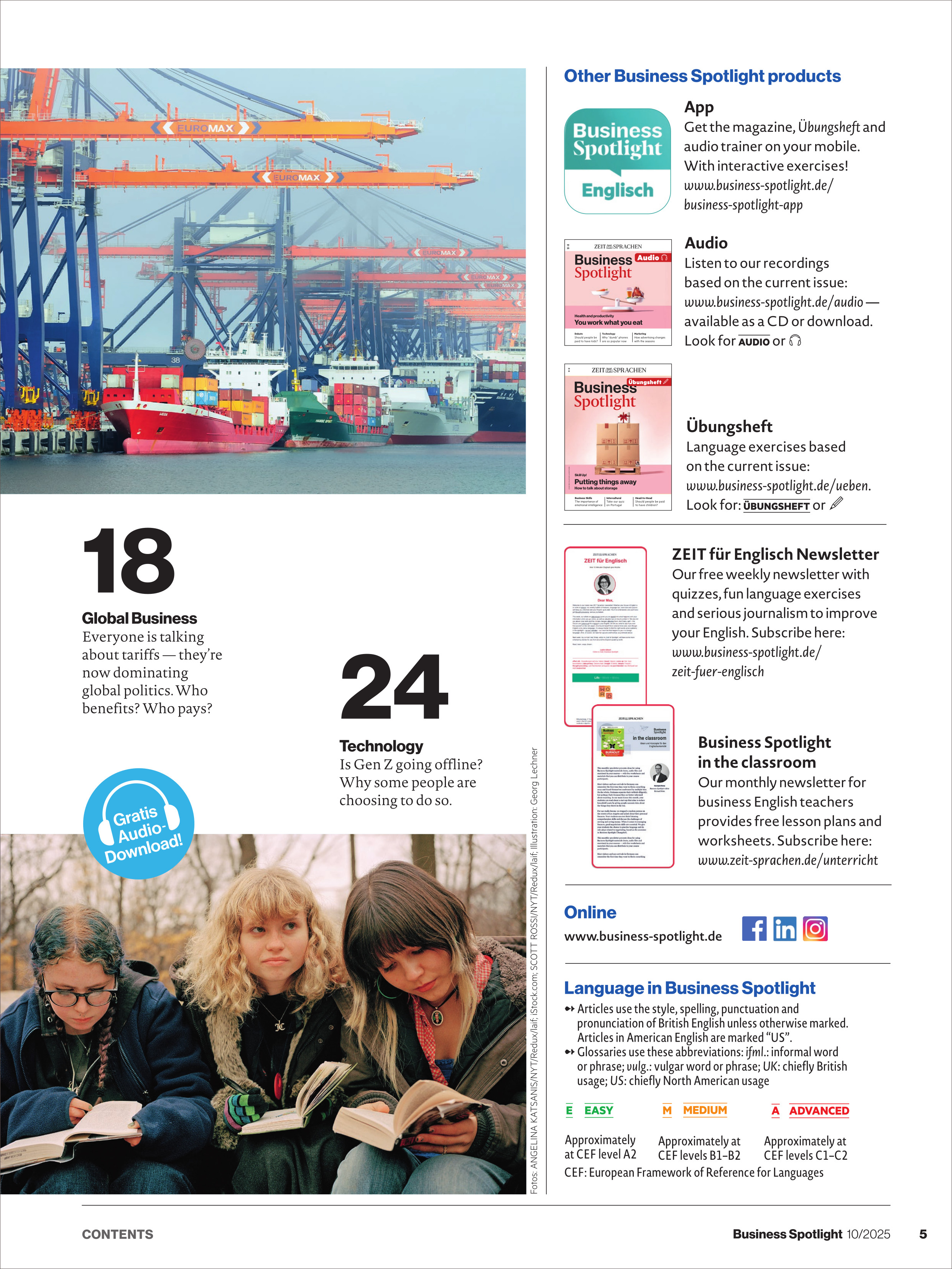Business Spotlight verbessert nicht nur Ihr sprachliches Niveau in der internationalen Geschäftswelt, sondern gibt Ihnen darüber hinaus auch Tipps und Tricks für interkulturelles Arbeiten sowie aktuelle Berichte zu interessanten Ereignissen der Business-Welt.