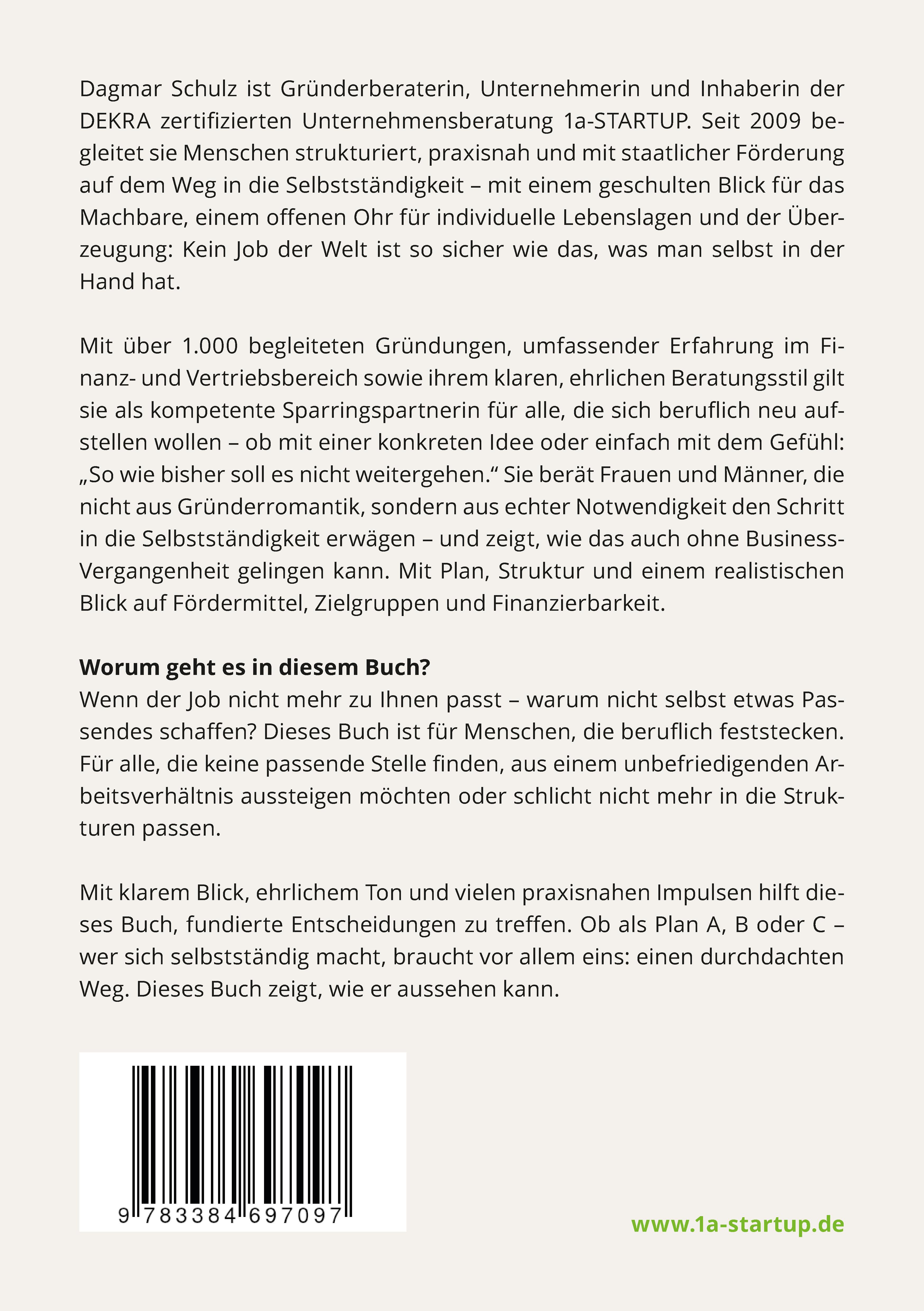 Wer Spaß an dem hat, was er tut, wird damit auch erfolgreich sein. Grundvoraussetzung ist der richtige Start.“ Dagmar Schulz (Jahrgang 1970) ist aus ganzem Herzen Düsseldorferin und seit 2009 selbstständige Unternehmens- und Existenzgründungsberaterin. Bereits 2002 hat sie ihr erstes Unternehmen und Joint Venture gegründet und dessen bundesweiten Vertrieb mit aufgebaut. Die ausgebildete Bankkauffrau, Sparkassenbetriebswirtin, Psychologischer Businesscoach und Social Media Manager ist quasi in der Bank groß geworden und war bis zu ihrem beruflichen Neuanfang im Finanzwesen tätig. Ihre Aufgaben, Funktionen und Positionen waren vielfältig, u. a. sammelte sie umfassende Erfahrungen in den Bereichen Vertrieb, Marketing, Finan-zierung, Akquisition, internatio-nales Projektmanagement sowie Coaching. Alles Kenntnisse, die sie heute optimal in ihre Beratung angehender Gründer einfließen lassen kann. Mit 38 kündigte sie ihre sichere Anstellung, um zu neuen Ufern aufzubrechen. Welche das genau sein konnten, wusste sie da noch nicht: „Ich wusste einfach, dass es beruflich mehr geben muss. Dass ich selbstständig und nicht für andere arbeiten möchte. Ich wollte nicht mehr nur leben, um zu arbeiten und etwas machen, was mich wirklich erfüllt. Und ich war mir sicher, dass sich immer eine neue Tür öffnet, wenn eine andere sich schließt.“ Dagmar Schulz tat das, was sie auch angehenden Gründern heute noch rät. Sie schrieb Notizen auf Zettel: Was kann ich besonders gut? Was möchte ich gerne die nächsten Jahre tun? Woran habe ich Spaß? Was macht mich auf Dauer zufrieden oder sogar glücklich? Was möchte ich hingegen nicht mehr beruflich machen? Was hat mich bisher gestört? Was hat gefehlt? Irgendwann stand die Entscheidung fest und 1a-STARTUP wurde gegründet. Dagmar Schulz teilte damals die Gedanken, die viele von Ihnen sicher auch haben: Sollte ich in meinem Alter noch-mal neu starten und ein Unternehmen gründen? Werde ich erfolgreich sein? Werde ich als Frau (in der Branche bzw. als Unternehmerin) ernst genommen? Heute kann sie alle Fragen klar mit Ja beantworten. Ja, man kann in jedem Alter noch einmal etwas Neues auf die Beine stellen und in die berufliche Selbstständigkeit starten. Als Unternehmerin ist sie als Ansprechpartnerin in ganz Deutschland gefragt, wenn es um Fragen rund um die Gründung von Unternehmen, Selbständigkeit oder die Vermarktung geht. Die zweite, aktualisierte Auflage geht auch insbesondere auf das Thema "Gründen in turbulenten Zeiten" ein.