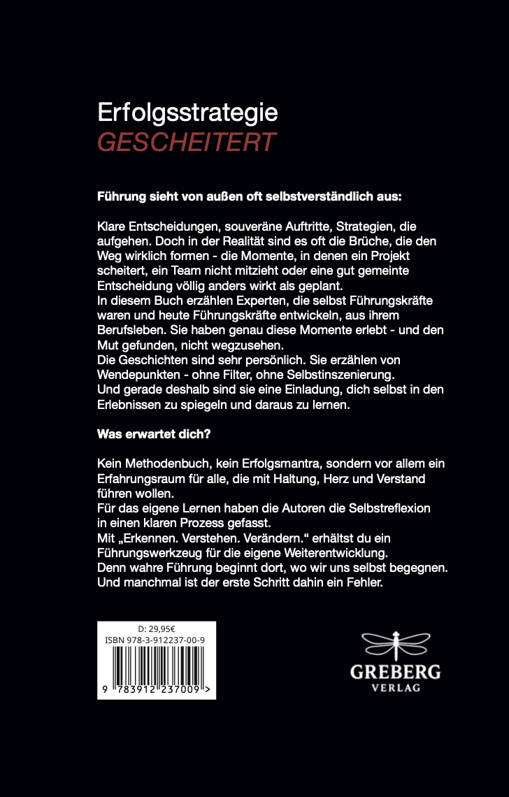 | Schlagworte | Agilität • Change Management • Erfolg • Erfolgsstrategie • Erkennen • Fehlerkultur • Fehlermanagement • Führung • Führungskraft • Führungskräfteentwicklung • Führungskräftetraining • Führungsnachwuchs • greb • Greb, Carsten • Greberg • Junge Führungskraft • Langenströher • Langenströher, Dirk • Leadership • Management • Managementtraining • Motivation • Persönlichkeitsentwicklung • Reflexion • Resilienz • Scheitern • Selbstführung • Selbstreflexion • Teamführung • Unternehmensführung • Unternehmenskultur • Verändern • Verstehen |