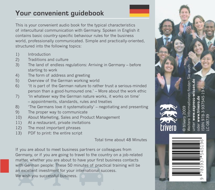 | Zusatzinfo | If you are about to meet business partners or colleagues from Germany, or if you are going to travel to the country on a job-related matter, whether you are about to have your first business contacts with German people: These 55 minutes of practical training will be an excellent investment for your international success. |